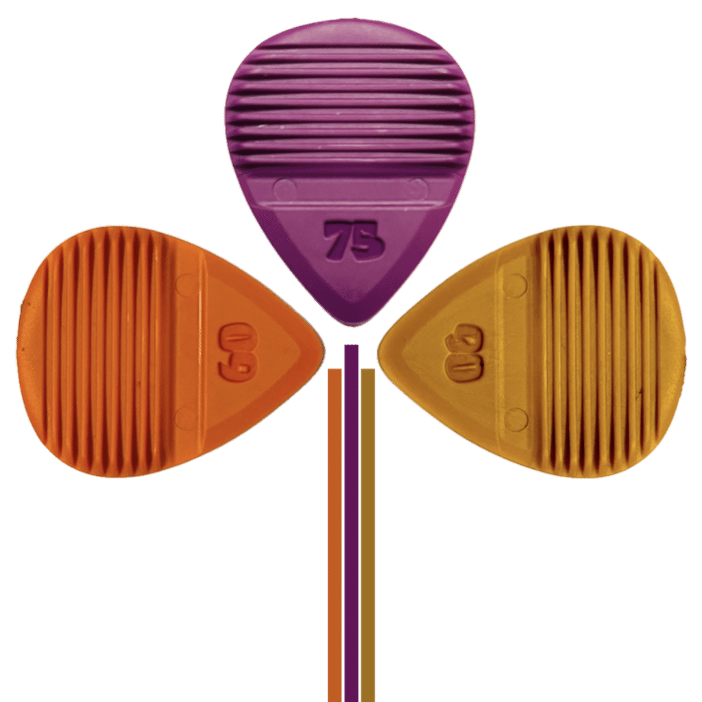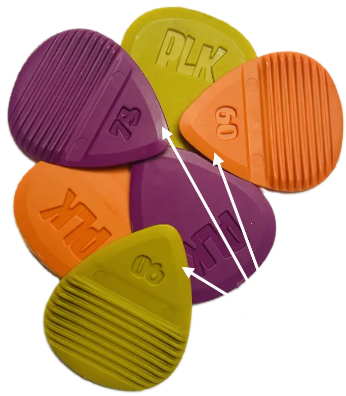 PLKs are available in three gauges – 0.60, 0.75 and 0.90 mm – yet all PLKs feel equally thick because the „flex-zone“ is where the music plays. Only here the PLK has the specified strength.